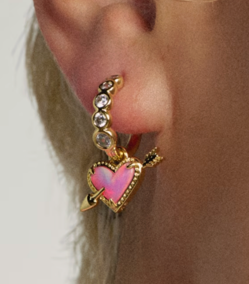 ARI HEART ARROW HUGGIE EARRINGS GOLD PINK OPALESCENT RESIN