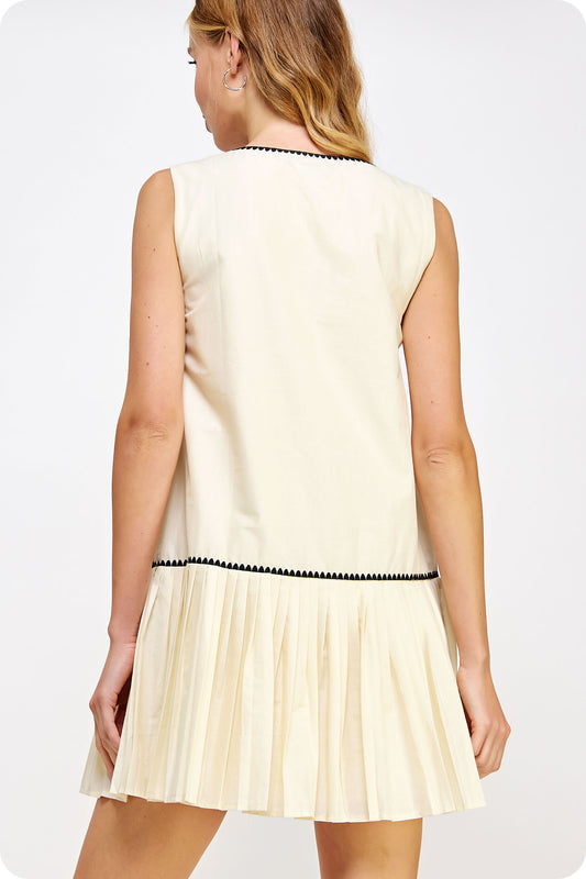 CONTRAST EMBROIDERED SLEEVELESS PLEATED MINI DRESS