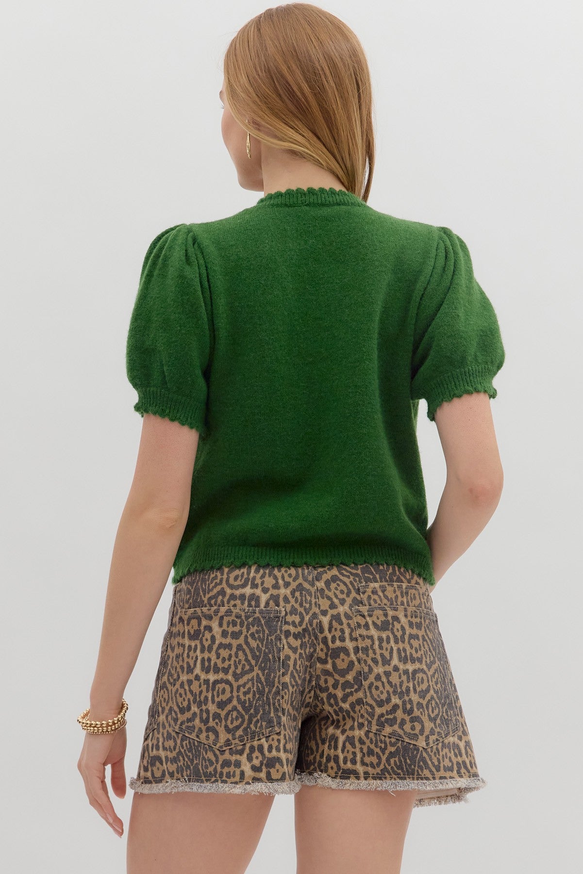 Solid short puff sleeve sweater knit top featuring scallop accent edge